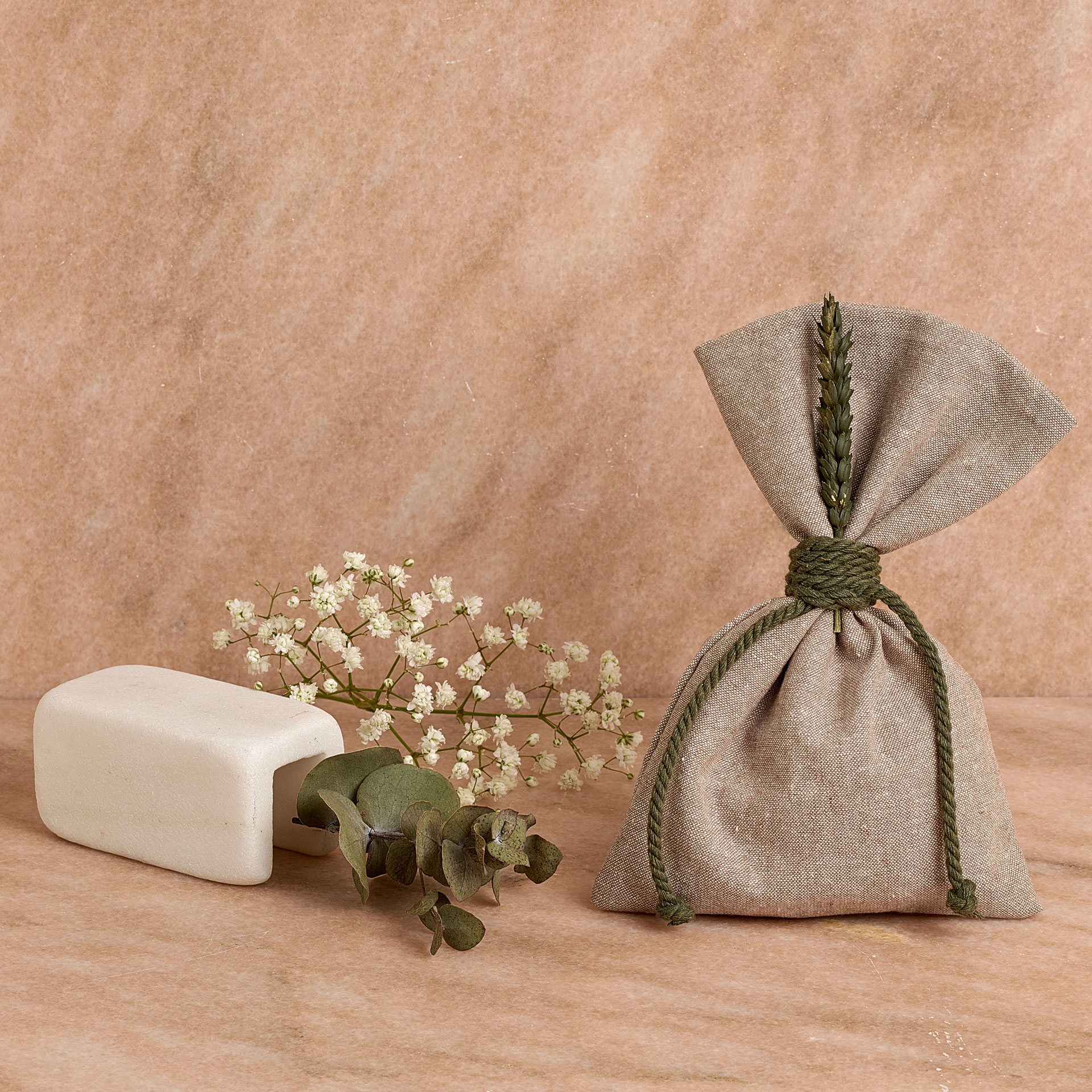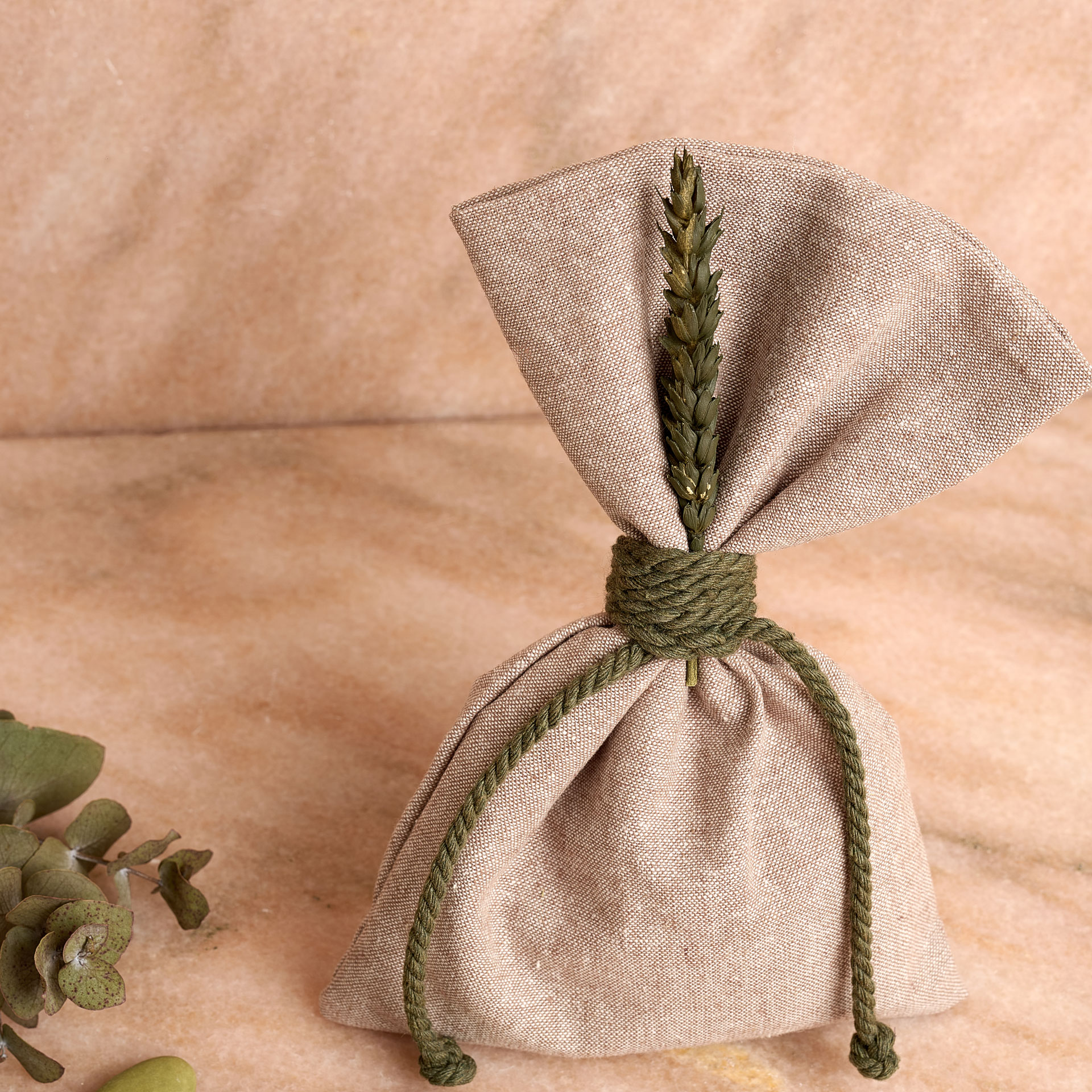 Μια σύνθεση απόλυτα ισορροπημένη, σε απαλούς φυσικούς τόνους, όπου το στάχυ λειτουργεί σαν λεπτή οργανική πινελιά.