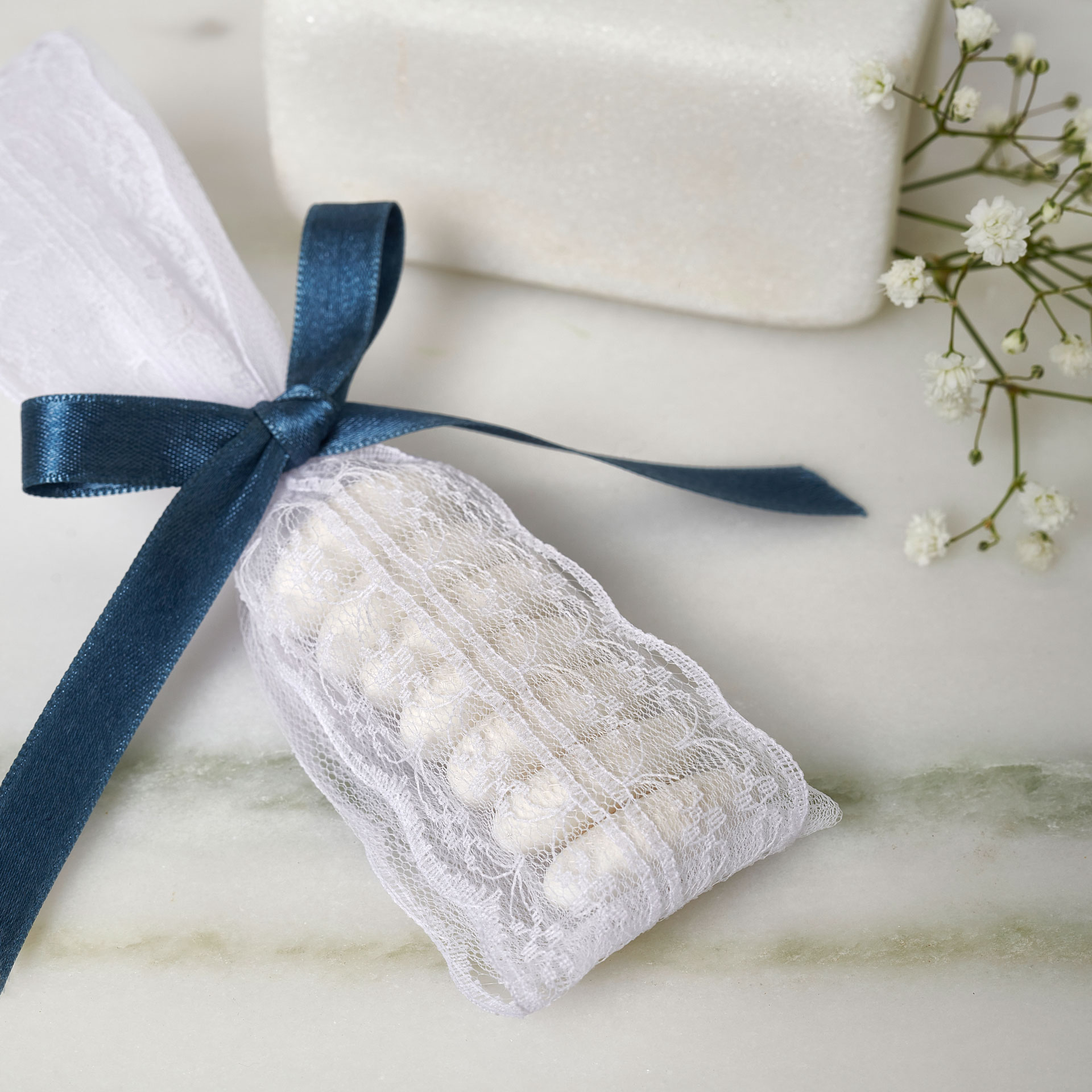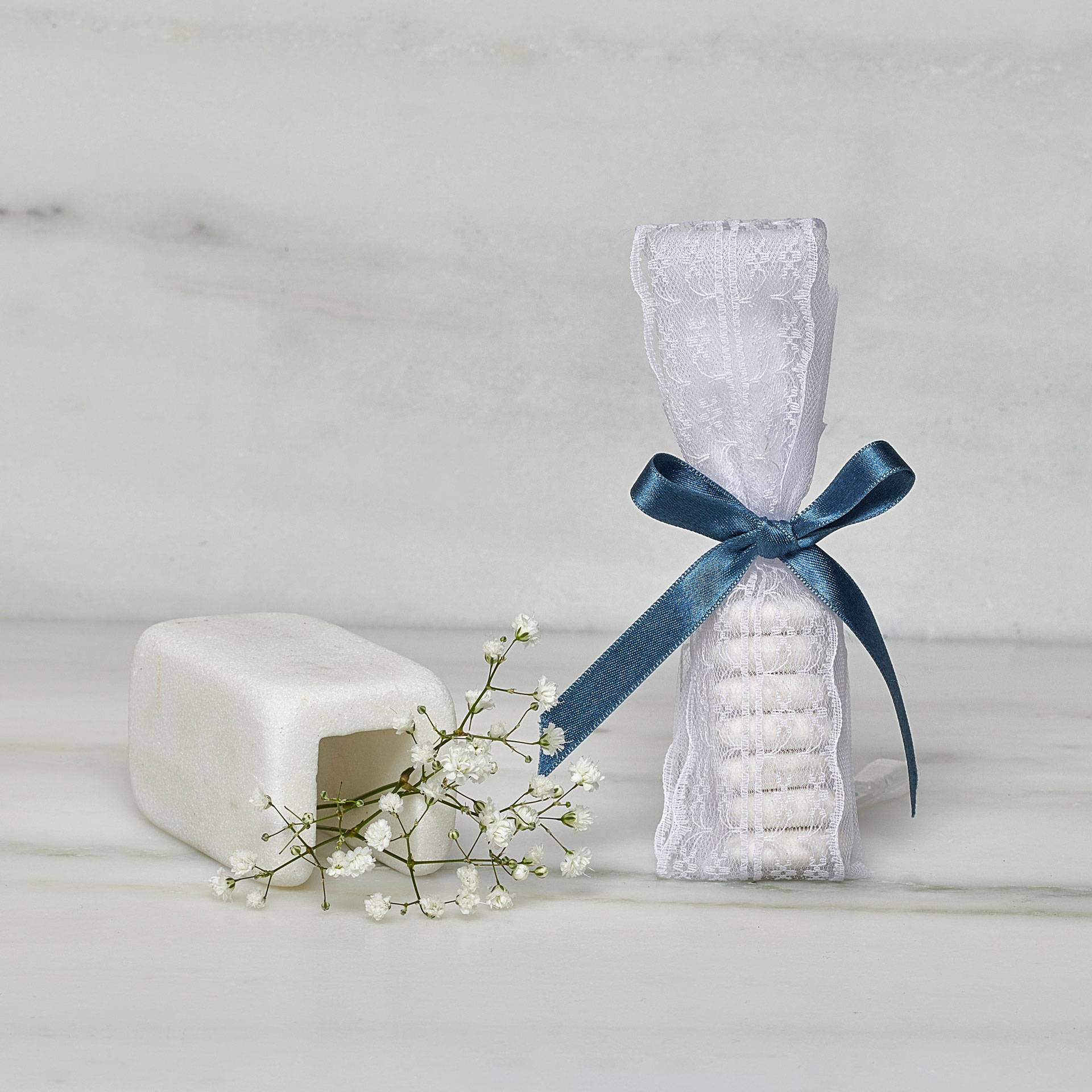 Λεπτεπίλεπτη μπομπονιέρα που συνδυάζει λευκούς τόνους με μπλε λεπτομέρειες