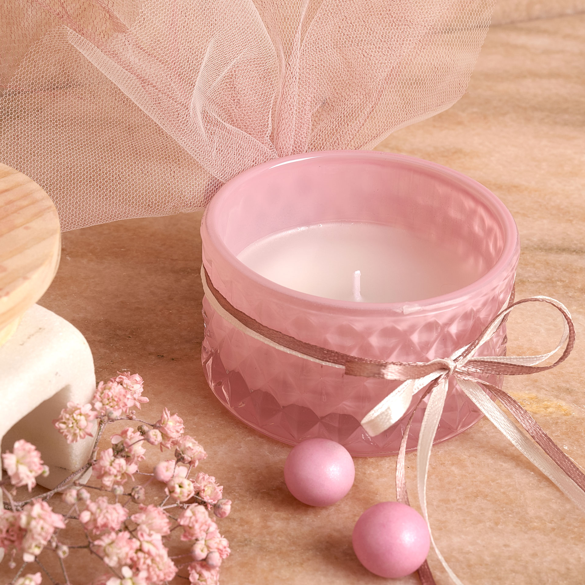 Γυάλινο στρογγυλό βαζάκι σε απόχρωση σάπιο μήλο, γεμισμένο με κερί, διάστασης 8,5 x 5,5 cm