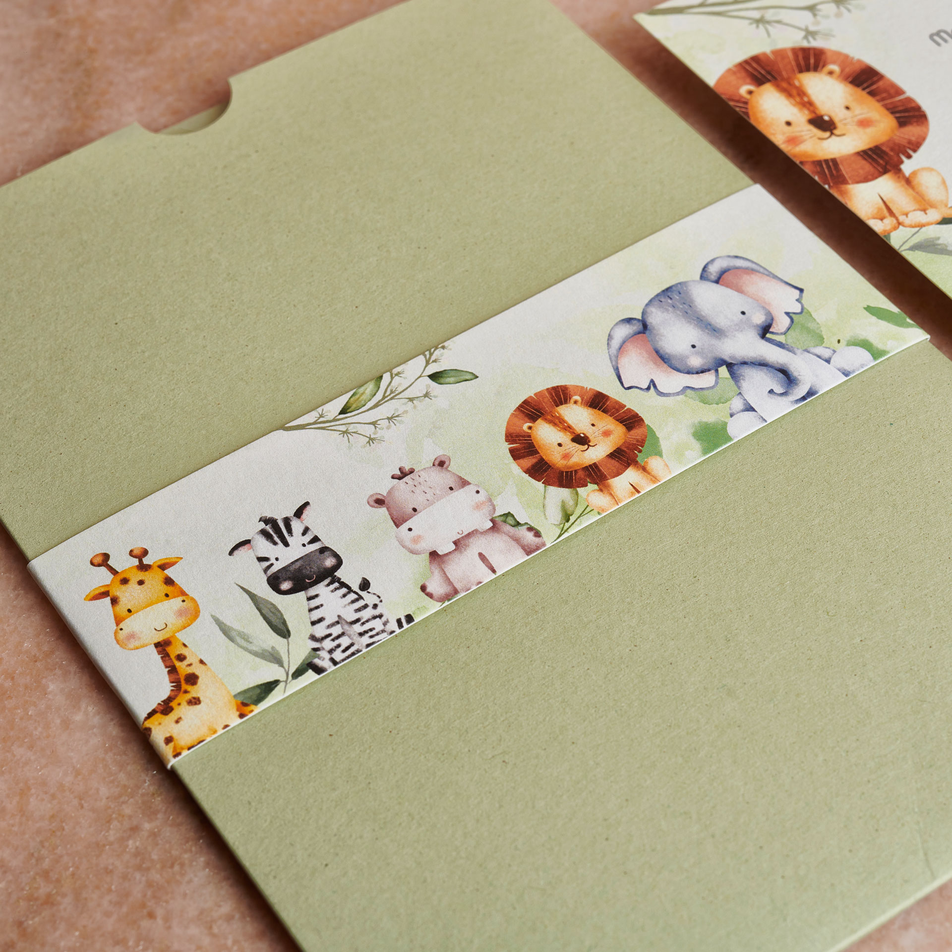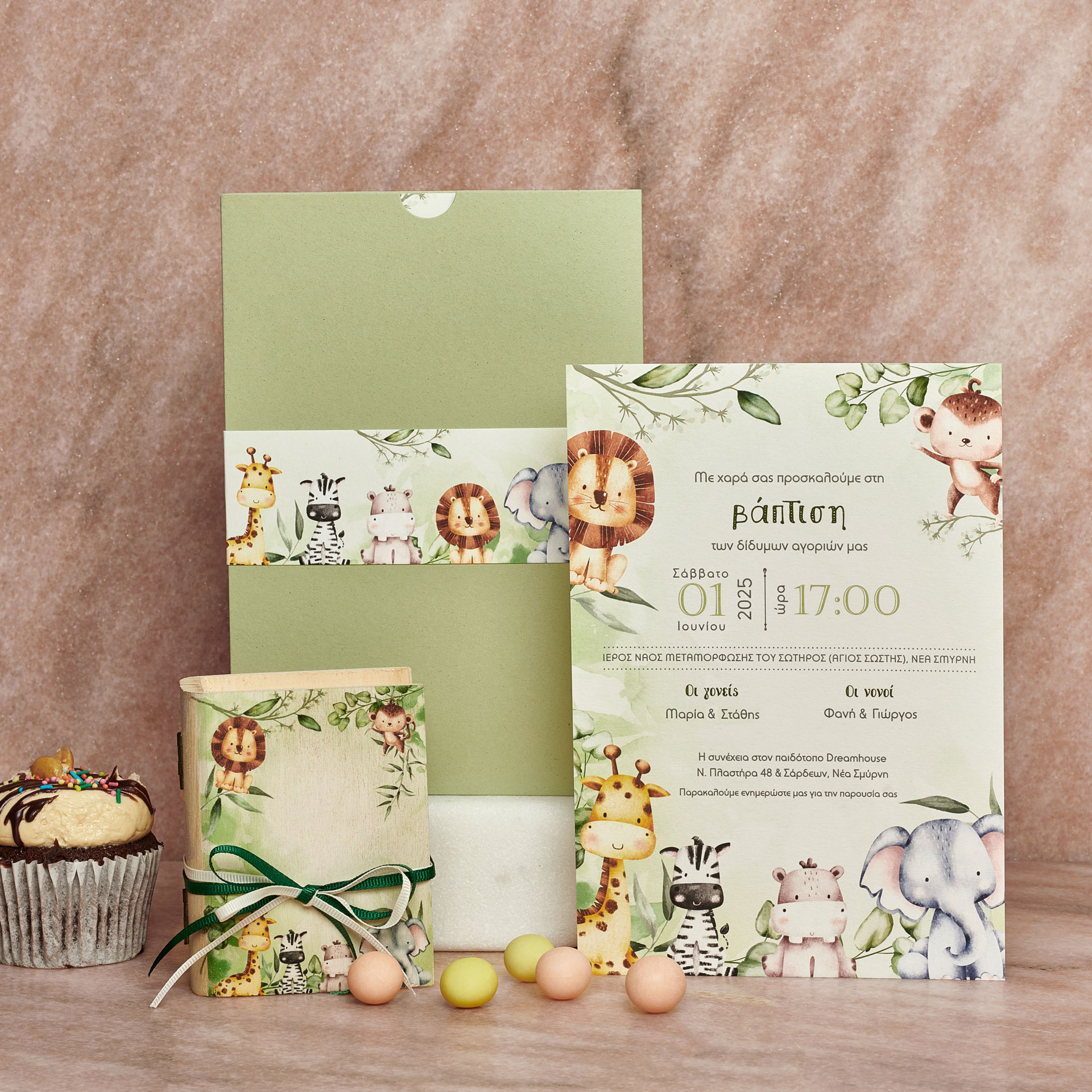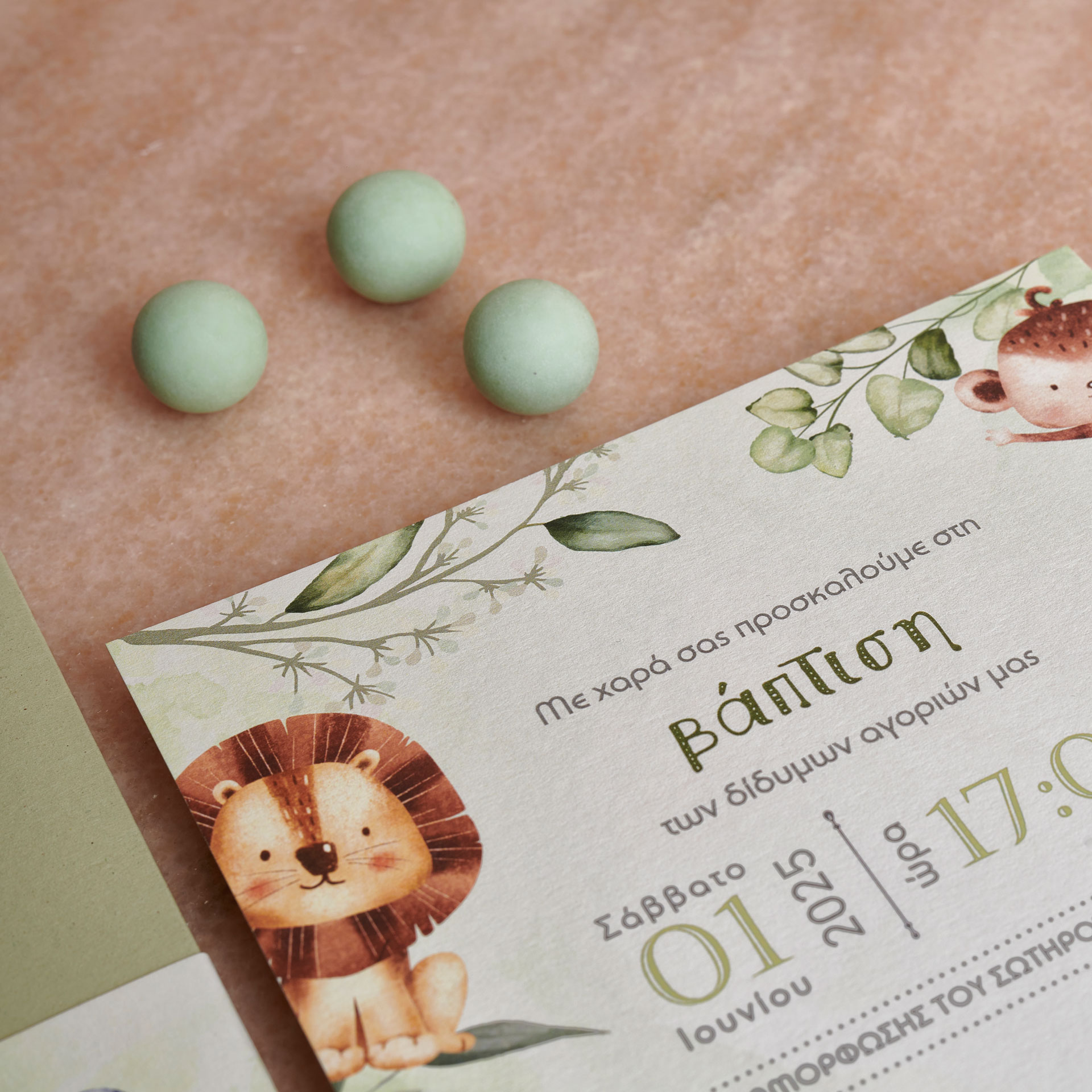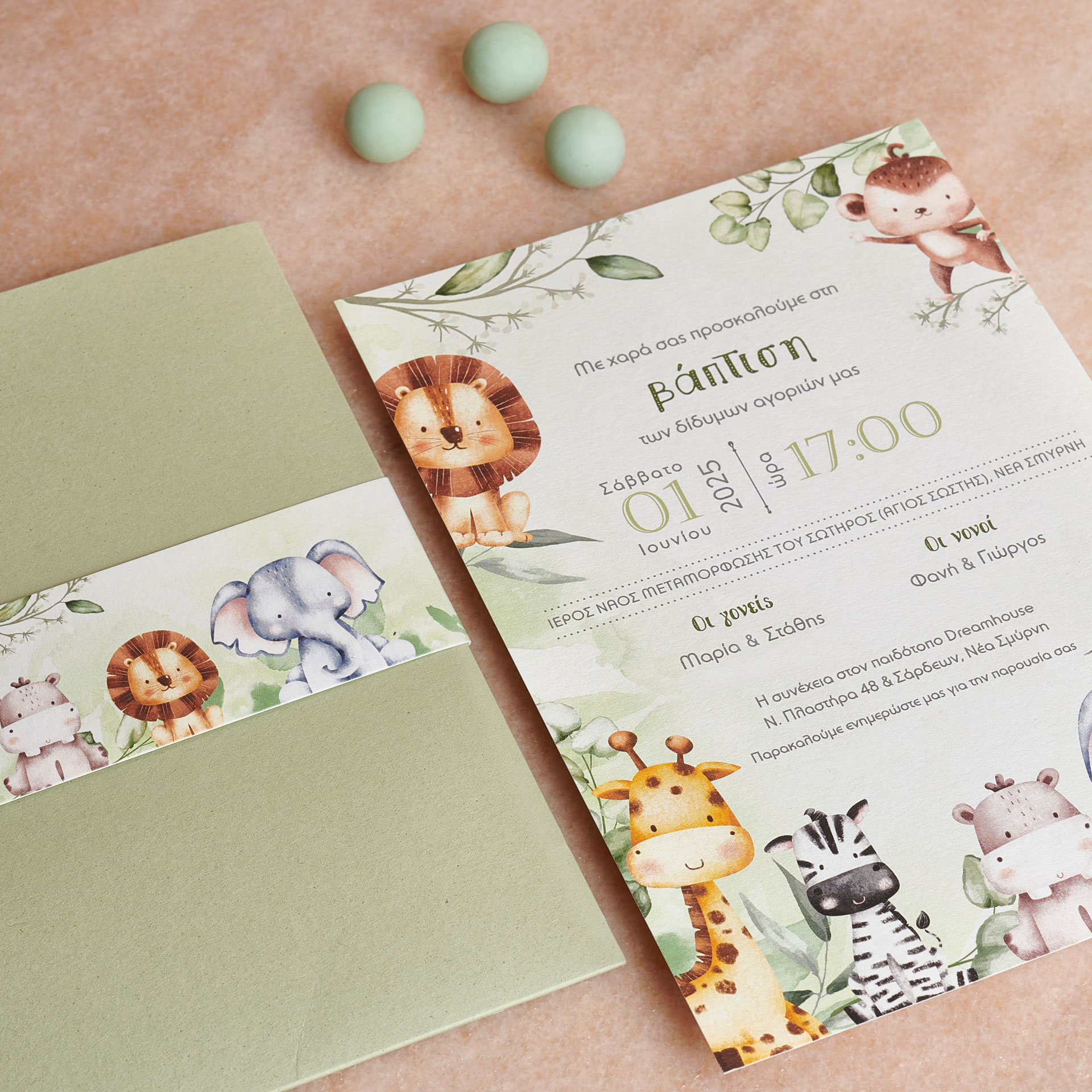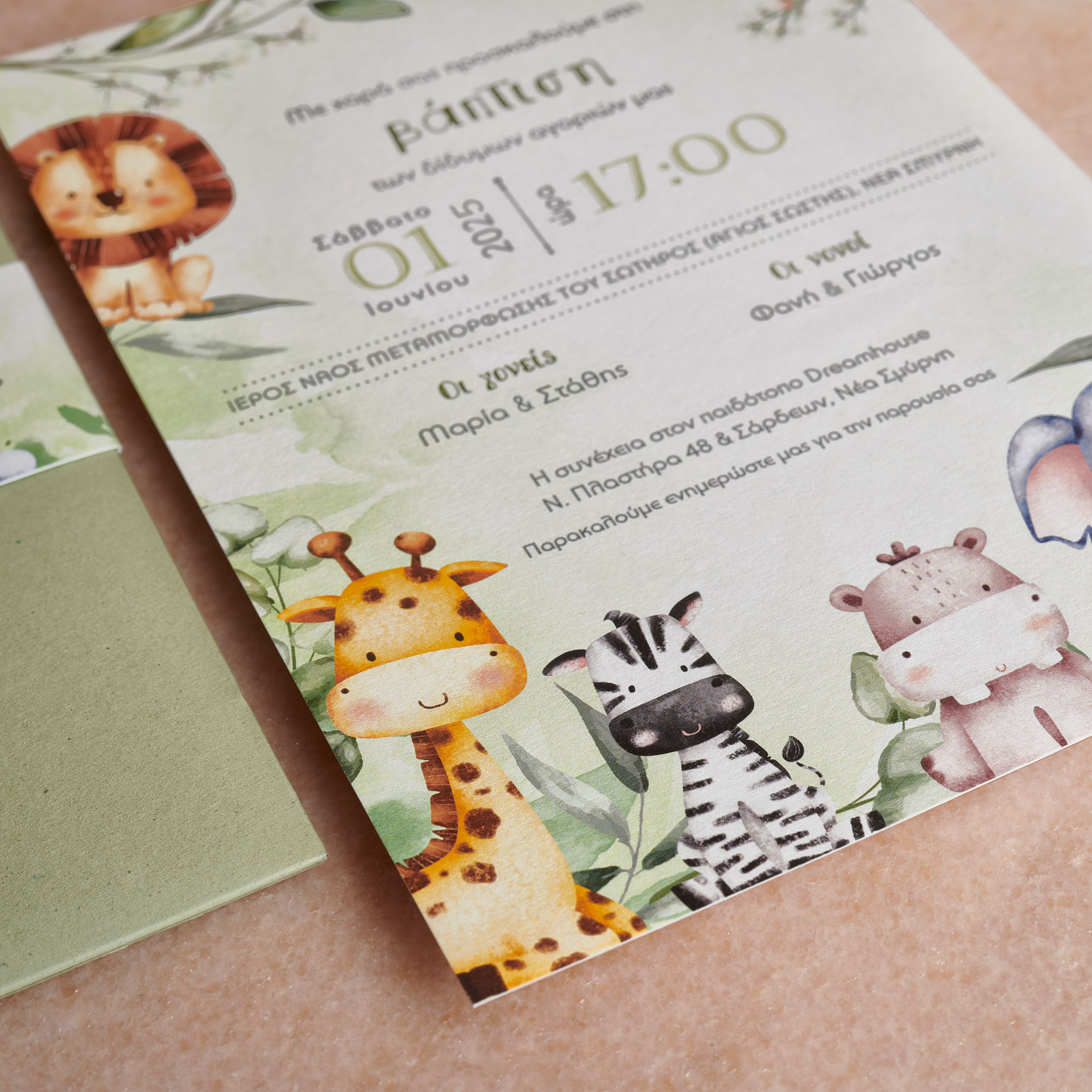 Μια ζωηρή παρέα από ζωάκια της ζούγκλας ζωντανεύει σε αυτό το χαρούμενο προσκλητήριο βάπτισης