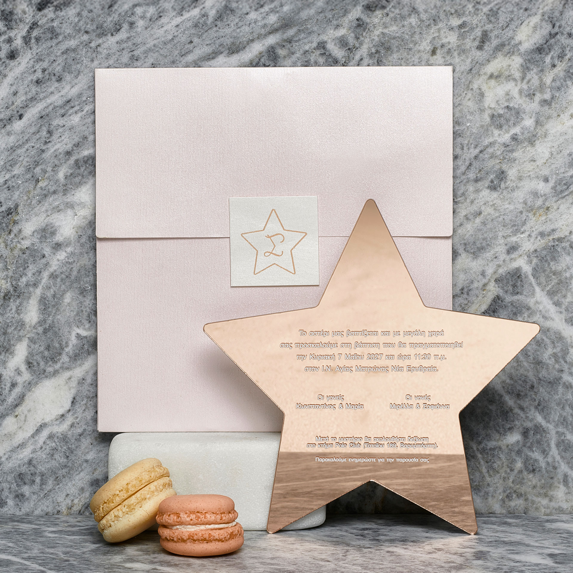 Πρόσκληση βάπτισης σε σχήμα αστεριού με ροζ-χρυσή λάμψη